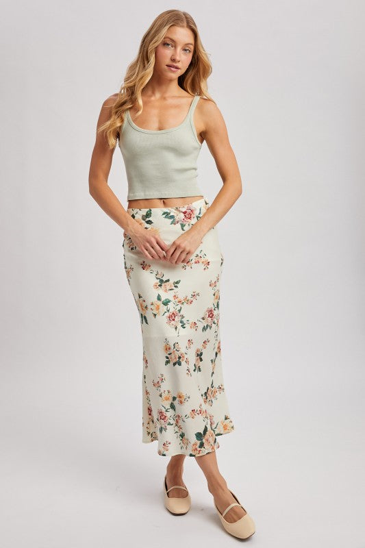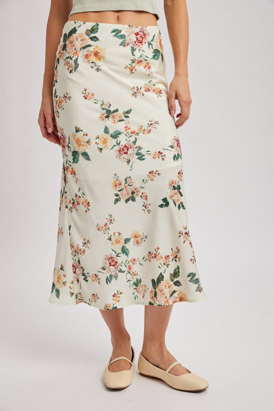 This is a midi-length, A-line skirt with a base fabric adorned with a vibrant floral pattern. The print features various flowers in shades of pink, peach, and teal, with green foliage. The skirt has a smooth, flowing silhouette and appears to be made of a lightweight, possibly satin or silk-blend material.